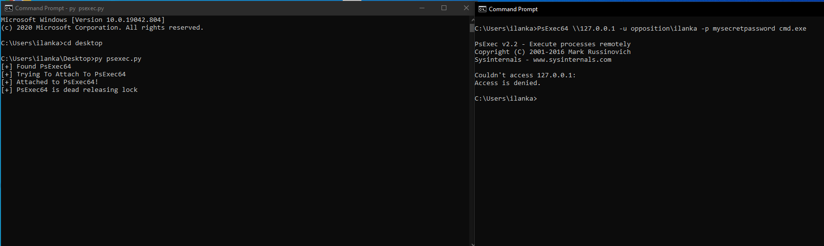 WNetAddConnection2W is the function that contains our secret password. If we’ll try to implement this we’ll run into a problem, Frida won’t have time to attach to the PsExec.exe process because we are giving the password as an argument, Let’s try it: